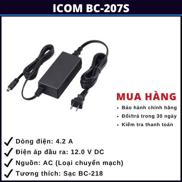 Icom BC-207S là bộ đổi nguồn AC-DC loại chuyển mạch (switching type) được thiết kế chuyên dụng cho đế sạc BC-218 của Icom. Với khả năng cung cấp điện áp đầu ra ổn định 12V DC và dòng điện 4.2A, thiết bị đảm bảo hiệu suất sạc nhanh, ổn định và an toàn tuyệt đối cho các phụ kiện và bộ đàm Icom. Thiết kế gọn nhẹ, độ tin cậy cao, phù hợp cho cả môi trường dân dụng và công nghiệp.