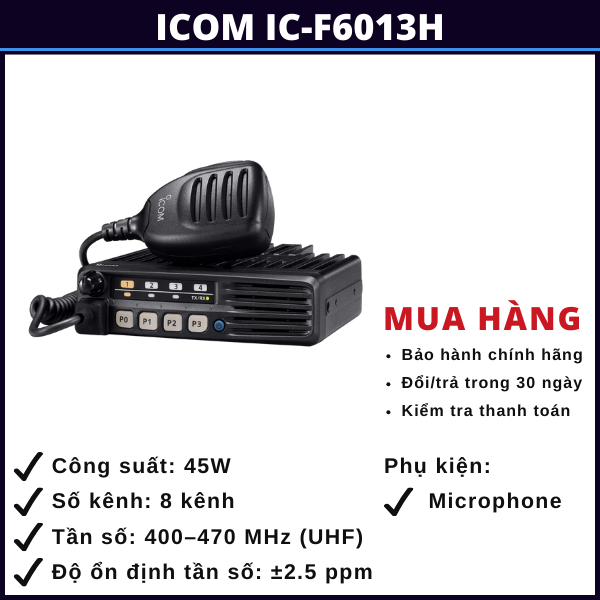 Là phiên bản UHF công suất cao 45W, IC-F6013H mang đến khả năng truyền tín hiệu mạnh mẽ trong môi trường có nhiều vật cản – từ khu nhà xưởng, tầng hầm, tòa nhà cao tầng cho đến hệ thống kho vận hoặc trung tâm điều phối.