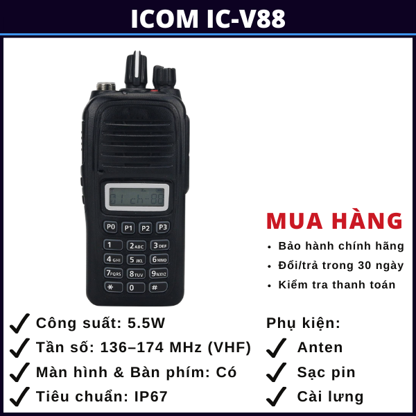 Bộ đàm Icom IC-V88 là dòng bộ đàm cầm tay chuyên nghiệp thuộc dải tần VHF (136–174 MHz), được thiết kế dành cho các doanh nghiệp, lực lượng an ninh, đội kỹ thuật, xây dựng và vận hành công trình cần liên lạc ổn định, sóng khỏe và pin bền.