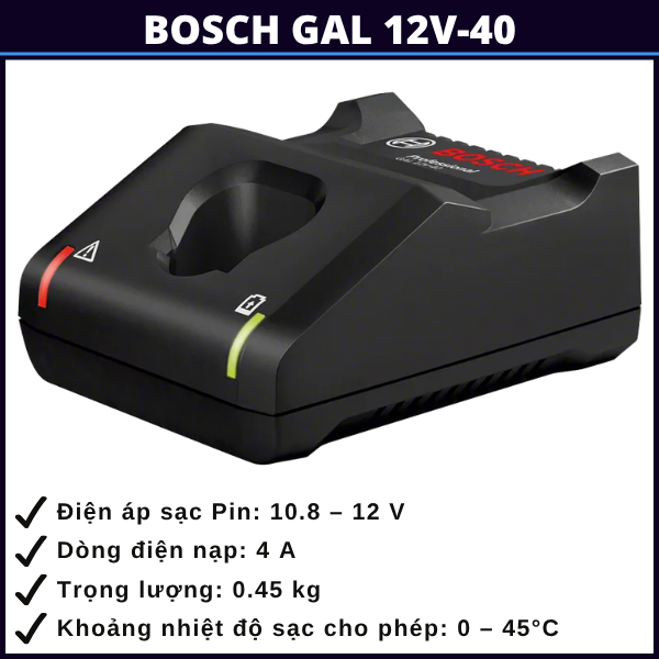 Trong môi trường làm việc chuyên nghiệp, thời gian là yếu tố quyết định năng suất. Với nhu cầu sử dụng công cụ không dây ngày càng tăng, việc sở hữu một bộ sạc nhanh, hiệu quả và an toàn trở nên thiết yếu. Bosch GAL 12V-40 được thiết kế để đáp ứng chính xác những yêu cầu đó, mang đến giải pháp sạc pin 12V tối ưu cho các chuyên gia trong nhiều lĩnh vực.